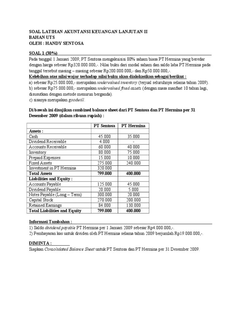 Nilai wajar aktiva berwujud dikurangi nilai wajar utang d. 9 respons untuk ' soal uts akuntansi keuangan lanjutan 2. Soal uts akuntansi keuangan lanjutan. Contoh soal dan jawaban akuntansi keuangan lanjutan 1 penggabungan usaha. Berikut ini adalah setoran rina dan sari :